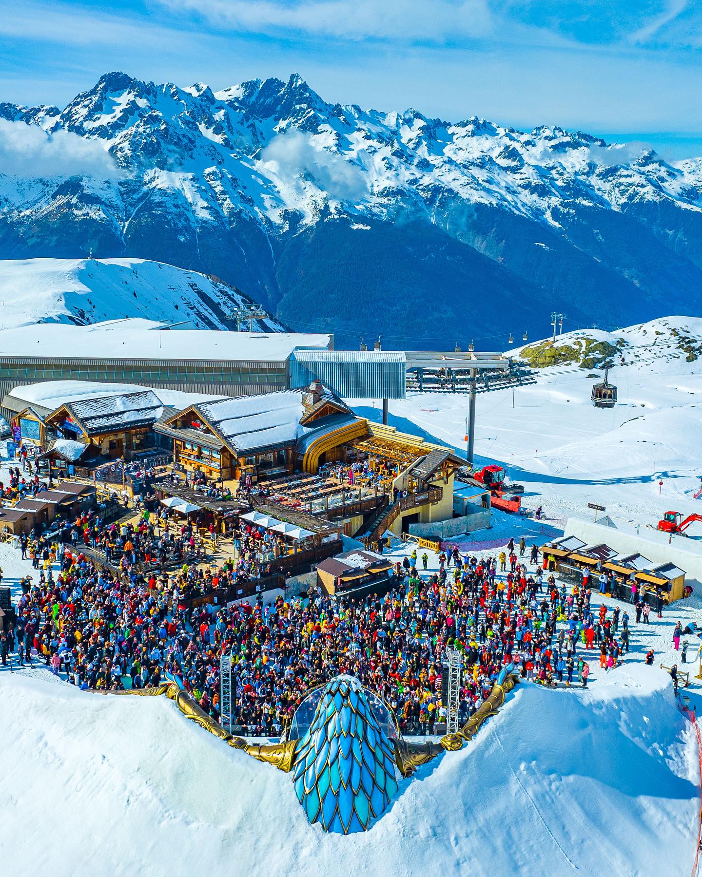 Mountain peaks become dramatic backdrops for daytime DJ sets. Snow-covered plateaus transform into dance floors. Ski lifts and trails connect festival-goers to different musical environments scattered across the resort.